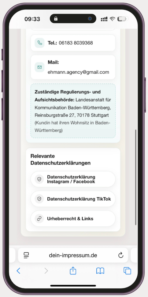 Ob auf dem Smartphone oder am Laptop – deine Impressumsseite passt sich automatisch jedem Gerät an. Ganz ohne Aufwand, 100 % responsive.