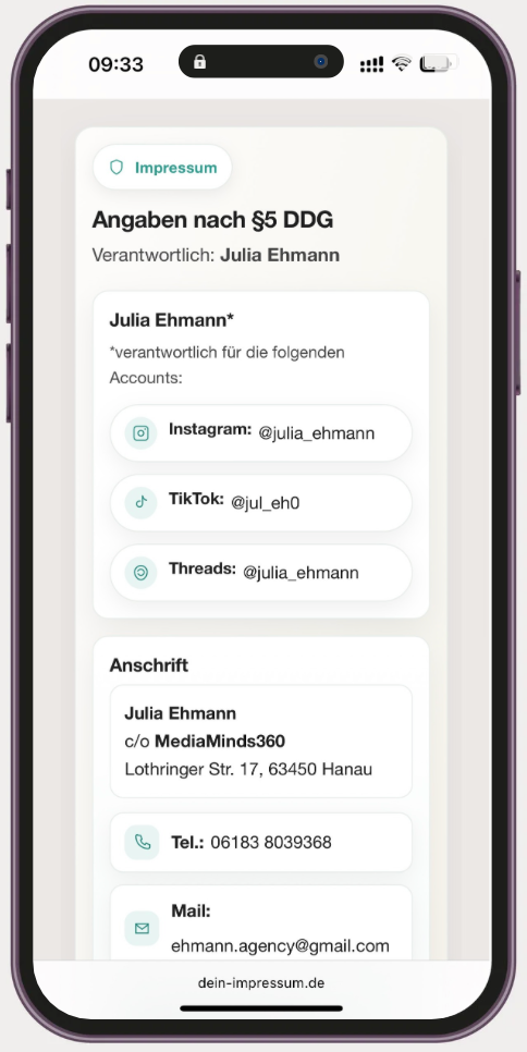 Im Impressum musst du zwei Kontaktmöglichkeiten angeben – E-Mail und Telefonnummer. Unser Service schützt dabei deine Privatsphäre und sorgt für Professionalität: